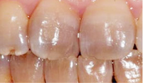 第一、是斑釉牙,又称为氟斑牙,为饮水中氟元素浓度过高所致。当氟浓度超过百万分之一时,就会影响牙胚的钙化过程,牙齿表面发黄,凹凸不平,出现点状或条状凹陷性缺损。